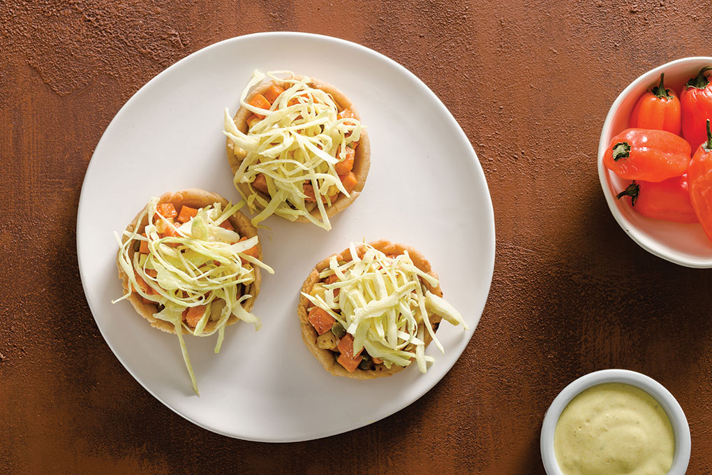 Mexican sopes offer a creative way to carry a variety of flavor builds—with some surprising featured players. These Roasted Sweet Potato & Apple Sopes with mustard-habanero slaw are built around a corn masa base with the intriguing addition of dry mustard powder, giving the dish warm, lingering heat. Diced sweet potatoes and Granny Smith apples are tossed with Dijon mustard, pumpkin seeds, olive oil and honey, then oven roasted. The Dijon adds a tangy undertone to the sweetness of the roasted vegetables and honey. The dish is topped with a cabbage slaw dotted with habanero chiles, balanced with Greek yogurt.