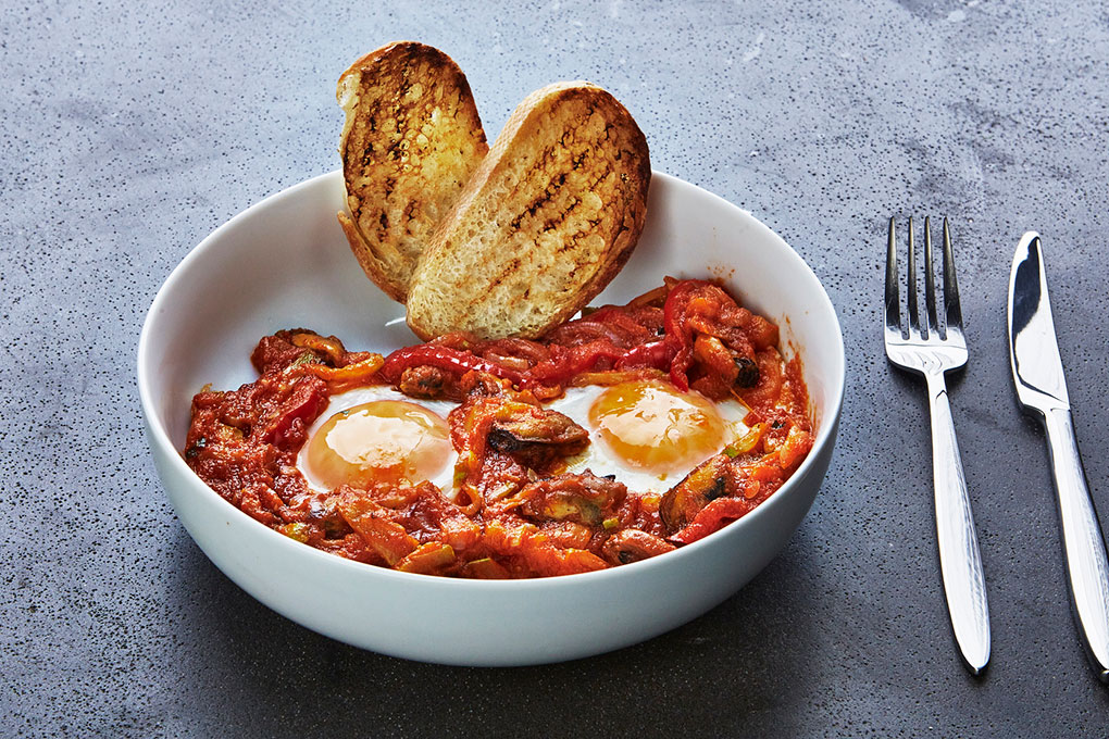 It’s hard to think of a more comforting dish than baked eggs. Shakshuka, that Eastern Med baked egg dish starring an aromatic tomato-pepper sauce, helped make them a modern brunch staple and opened up the doors for creative iterations. Its flavor profile and format have found a solid fan base among American diners, encouraging chefs to riff on the flavor combination and look to other global pantries for signature renditions.