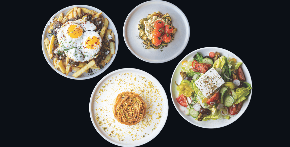 Andros Taverna in Chicago puts forth a menu of modern Greek cuisine (clockwise from top right): Ikaria, a brunch dish of egg whites slow-cooked and scrambled with zucchini; the Andros Salad with barrel-aged feta; Vanilla Soufra, a ruffled custard pie with crispy phyllo and roasted pear; and the Olympia, loaded fries with eggs and gyro.