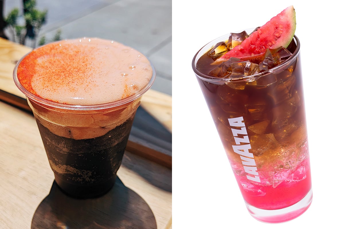 Credit: Paper Son / Qargo Coffee The Guava Pillow coffee soda (left) is topped with guava purée foam and dusted with li hing powder at San Francisco’s Paper Son Coffee. Qargo Coffee adds guava and lemon to its Guava Bay Cold Brew (right).