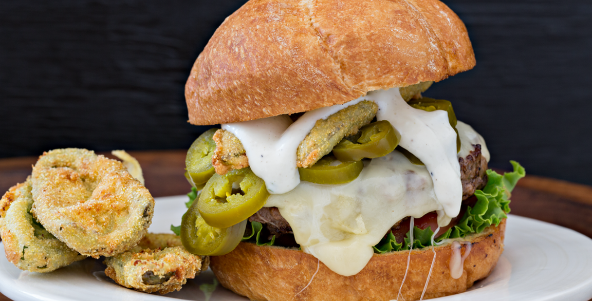 Jalapeño Sausage & Cheddar Burger: Burger topped with jalapeño sausage, fried jalapeños, cheddar, lettuce, tomato and ranch dressing