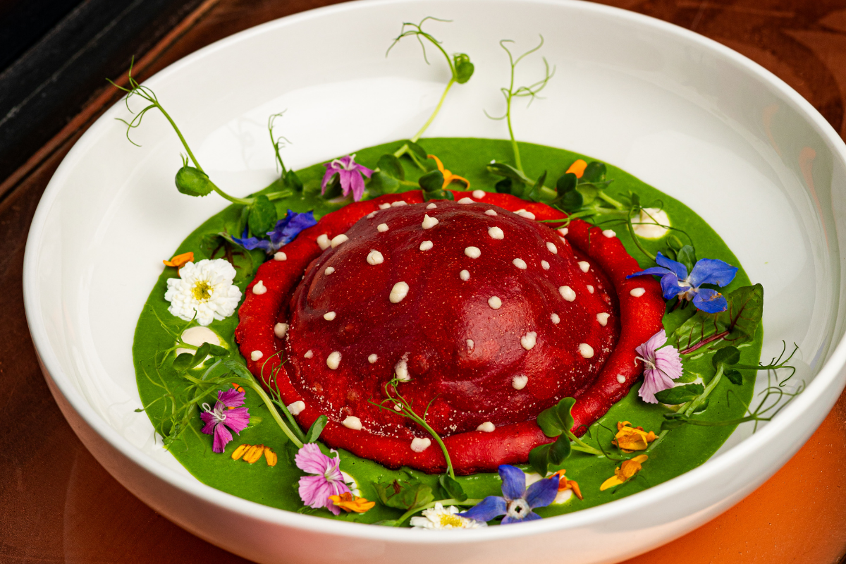 As if plucked from a fairy tale forest, the King Royal Trumpet from Third Kingdom stars a large raviolo styled like a spotted mushroom, with a variety of flowers and broccoli-spinach sauce enhancing the overall effect.