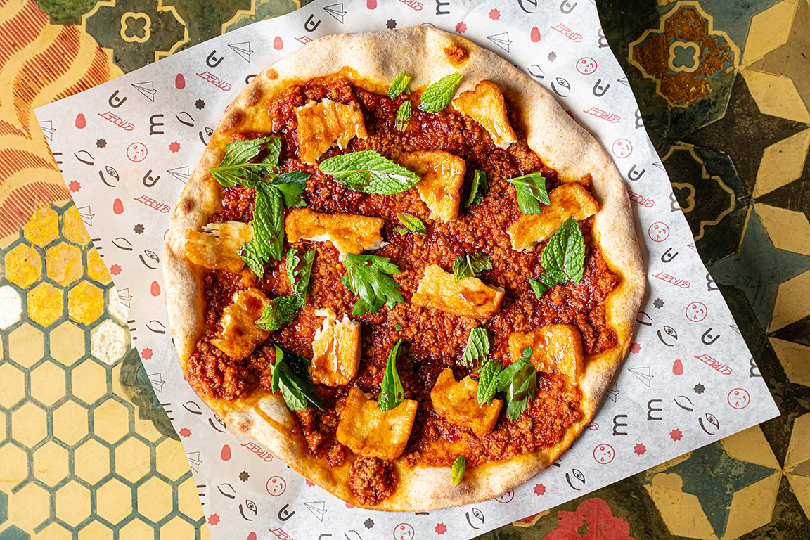 Lahm-bi Ajine: Lebanese flatbread with ground lamb, tomato, pepper paste, Fresno chile and pomegranate molasses, topped with crispy halloumi and mint