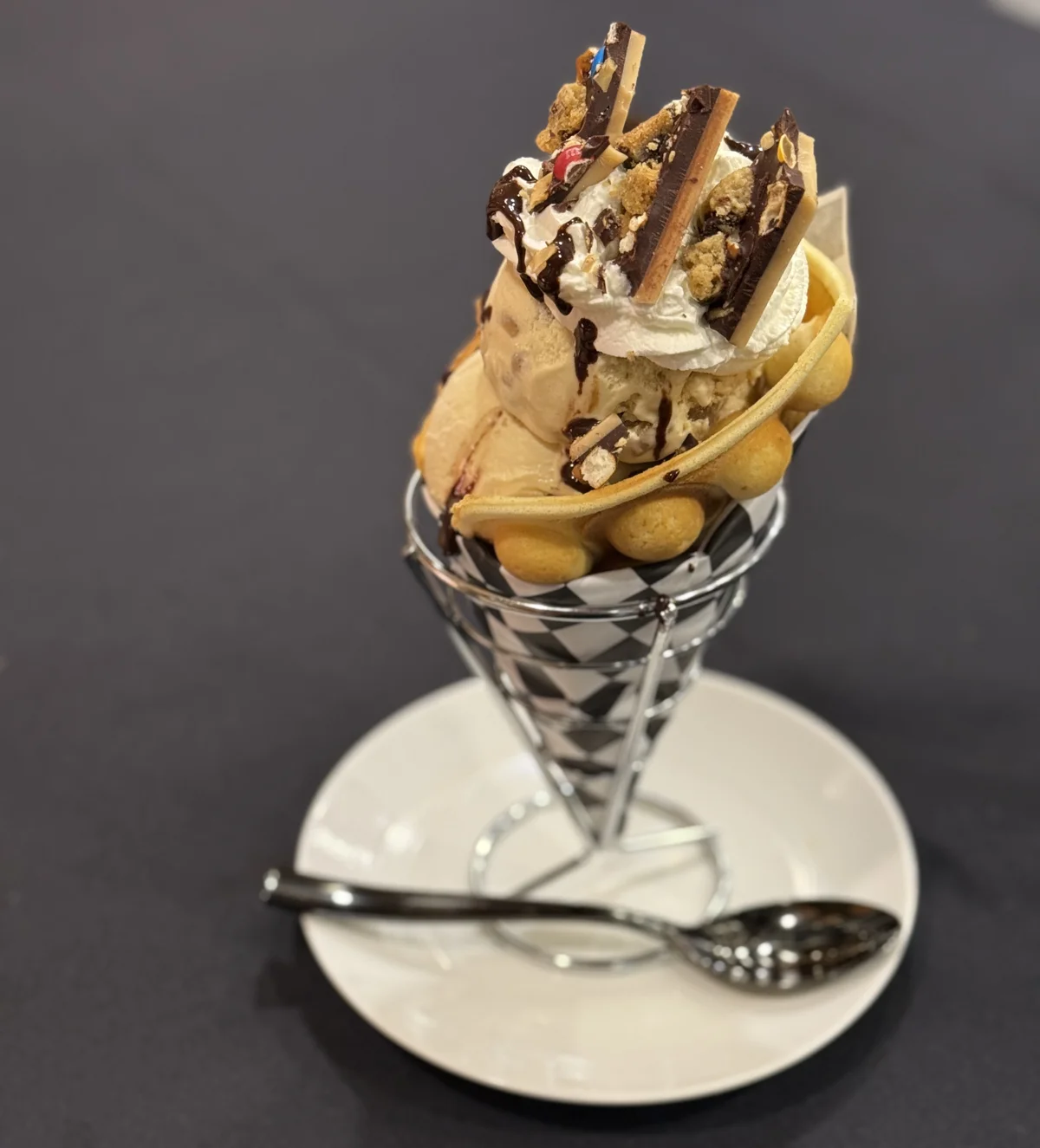 Her creation features Chocolate Peanut Butter Flutter cookie dough added to ice cream, which was paired with dark chocolate toffee featuring pieces of Chocolate Chip cookies. The elements are served in a whimsical puffle (aka bubble waffle) that incorporates Triple-Chocolate cookie dough. “Yes, I went all in on the cookie dough,” Covert says of her use of three sponsored items from Otis Spunkmeyer. “I really wanted to use it in ways beyond just baking cookies.”