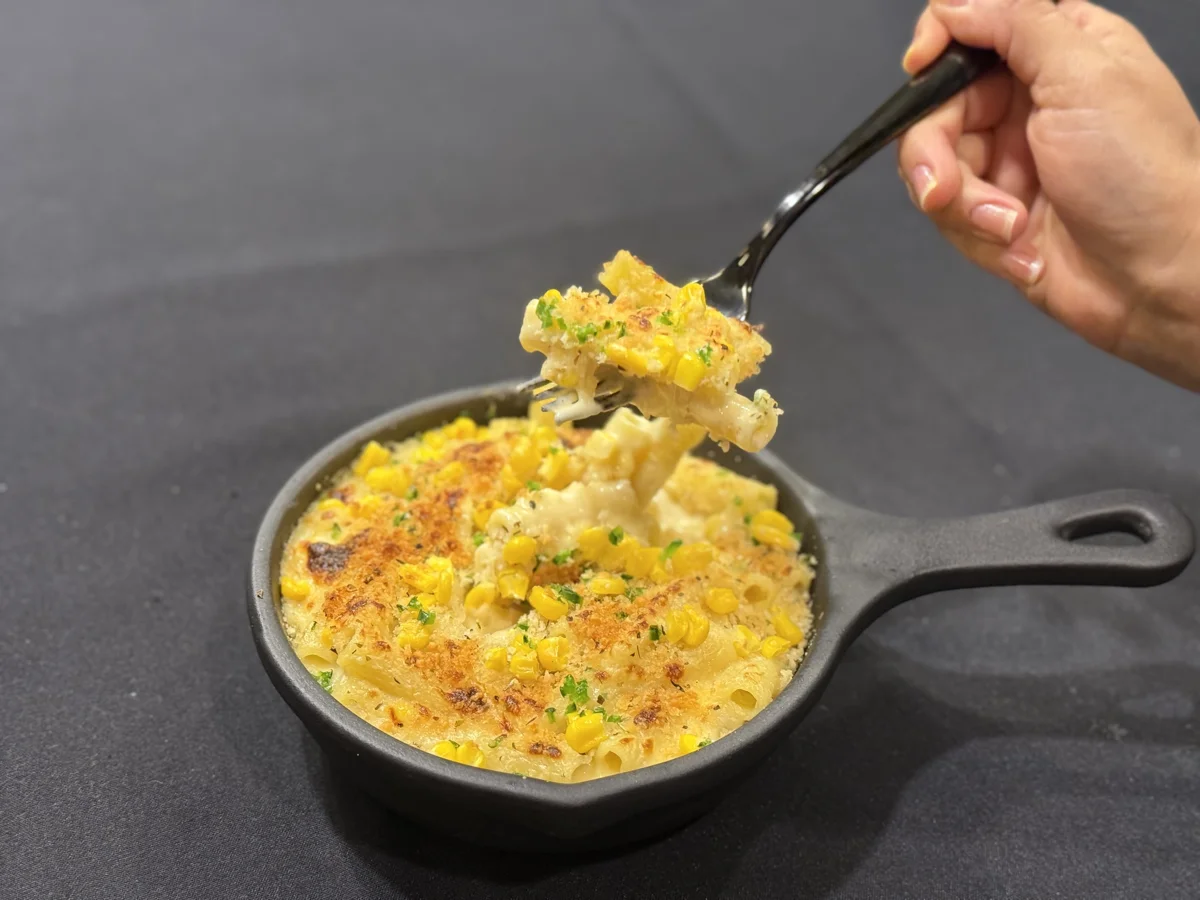 Despite all the cheeses and cream, the dish doesn’t feel heavy, Covert insists. “The triple cream is silky and light, while the mascarpone adds a smooth, airy richness rather than weighing down the dish. Then, by folding in fresh roasted corn and jalapeño, plus finishing it with cilantro, it has a bright freshness that balances the richness.” The result is a combination of sweet, salty, savory, creamy, tangy and spicy.