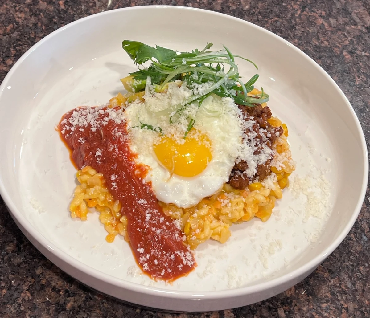 Red Lentil, Corn & Fiscalini Aged Cheddar “Elote” Risotto with Crispy Chorizo and Fried Egg
