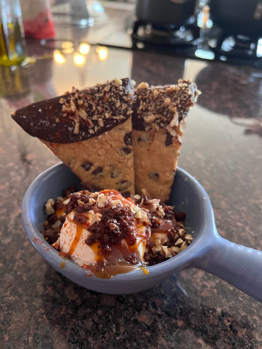 Feldman pairs the ice cream with chocolate chip cookie wedges made from Otis Spunkmeyer frozen cookie dough, dipping these in chocolate glaze with more pecans, salt and smoked paprika. “I wanted the cookie wedges to emulate tortilla chips to use for scooping or dipping into the sundae.”