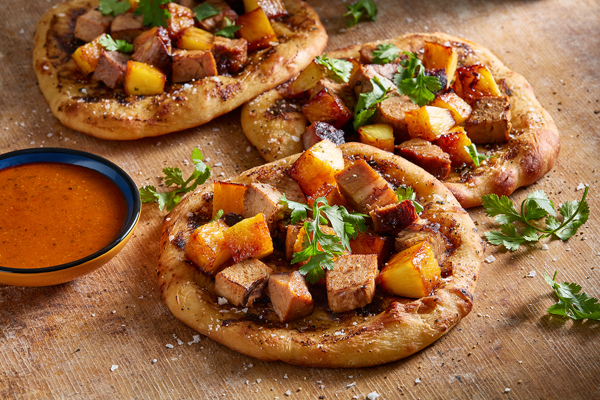 The dish is a flavor bomb of savory, sweet and tangy elements. “The pork is tender and flavorful, infused with the savory richness and subtle sweetness of the Custom Culinary sauce in the adobo marinade. The flatbread provides a neutral base to slather the earthy sweetness of the black garlic butter, complementing but not overpowering the other components,” says Hallowell. “The pineapple adds bright freshness, with its acidity and additional sweetness balancing the richness of the meat.