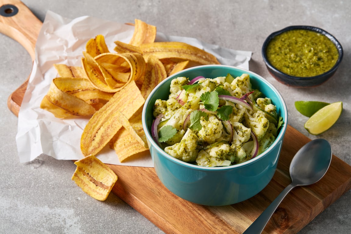 Each bite offers a vibrant blend of flavors, he says. “The pesto provides a bold kick of heat and freshness, complemented by the subtle nuttiness of the cauliflower and crunch of cucumber.” A touch of cilantro contributes a bright note. “This combination achieves a harmonious balance of spicy, savory and cooling sensations, making it an irresistibly craveable dish that won’t leave you longing for the traditional seafood component.”