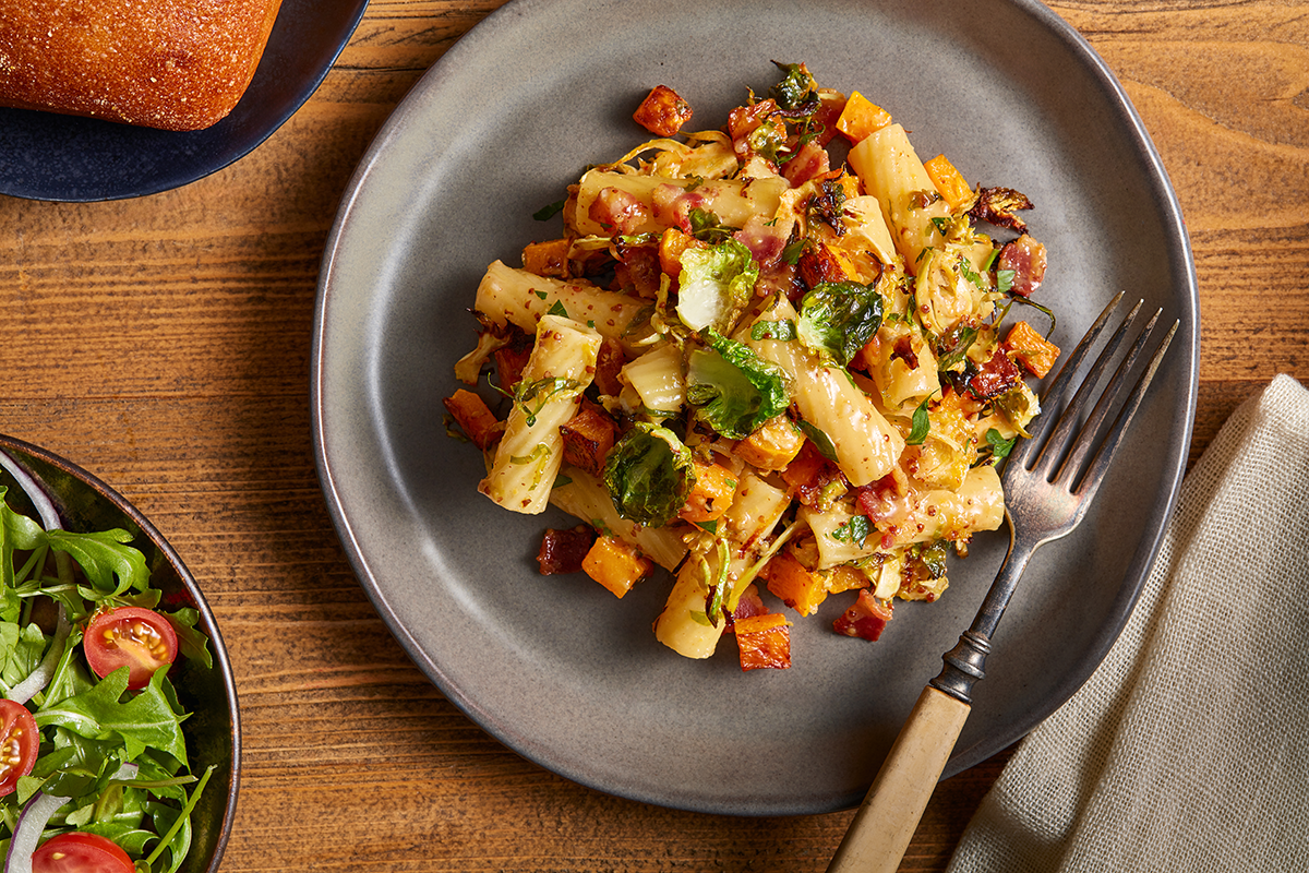While the Barilla Frozen® Rigatoni made cooking “super quick and easy,” she says, the obvious crave factor of the bacon-honey dressing is worth its own callout. “I’ve played around with bacon jam in a couple of applications—bacon and Brussels sprouts are a no-brainer go-to for me,” Bograd says. With honey and smoky bacon trending as flavors, “I wanted to create a sauce that could be flexible in use, as a dressing, a topping, a spread and so on.” Hot honey could be swapped in to kick up the heat and further play to current trends.