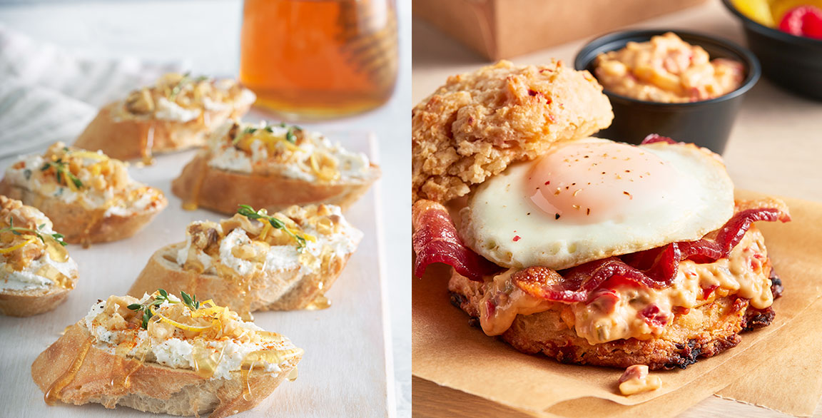 It’s not the sheer number of notes on the score that produce melodies that make the heart sing. It’s the right notes in the right combinations. Flavor experiences that stir the soul also can result from the artful blends of just a few simple ingredients. Jonathan Buckholz, Research and Development Specialist at Bloomin’ Brands, produced two culinary compositions for Kitchen Collaborative—the Honey, Herb Goat Cheese and Walnut Crostini and the Spicy Price*s® Pimiento Cheese Breakfast Biscuit—that reflect his flavor philosophy.