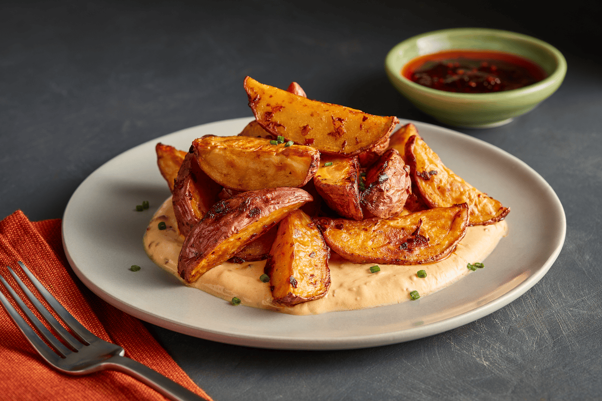 “I use yogurt and potatoes a lot, although not necessarily with Asian flare,” says Randol. “It’s exciting to play with favorites like roasted potatoes and give them new flavor and textural balance.” Here, the chili crisp does impart Asian cues, he says. “The yogurt balances out some of the spiciness and fattiness of the oil, and the chili crisp isn’t so spicy as to undercut the cooling effect of the yogurt.” He finds the oil delivers a heat rating of 6 out of 10. “But the yogurt backs that down to a 4, so the rich Asian flavors you expect shine through.” Randol suggests using purple potatoes or yams to further an Asian sensibility.