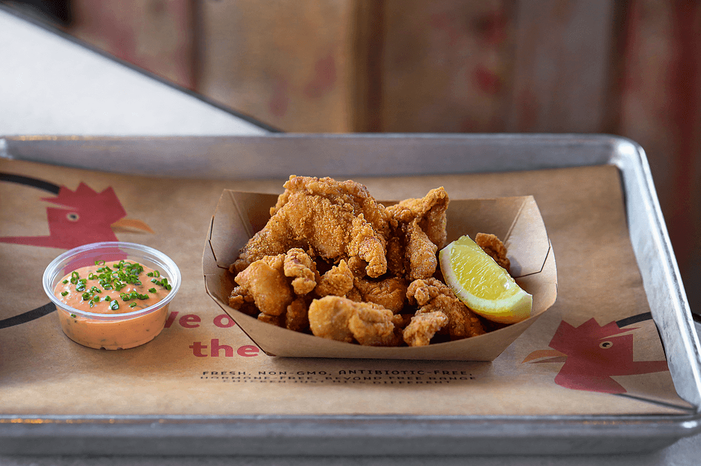 Photo Credit: Crack Shack Crack Shack’s Chicken Oysters, pickle-brined and cornmeal-crusted, elevate the tenders game. They’re served with a lemon wedge and rémoulade sauce.