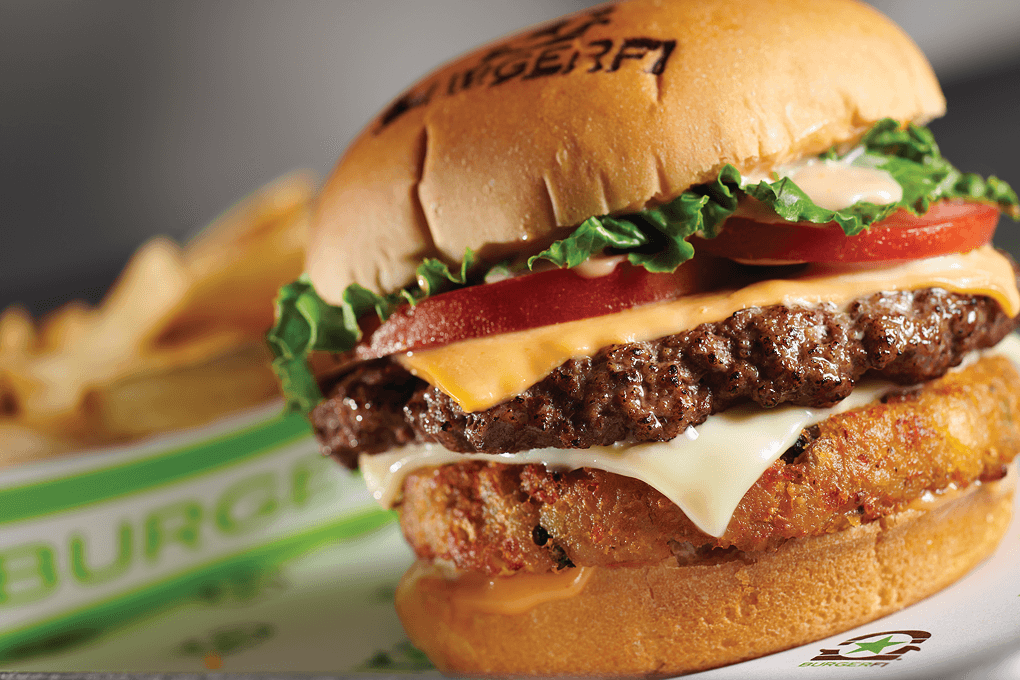 Photo Credit: BurgerFi The Conflicted Burger at BurgerFi is a clever option that gives flexitarians the best of both worlds with two patties (Angus beef burger and VegeFi burger, a plant-based patty), American cheese, white cheddar, lettuce, tomato and BurgerFi Sauce.