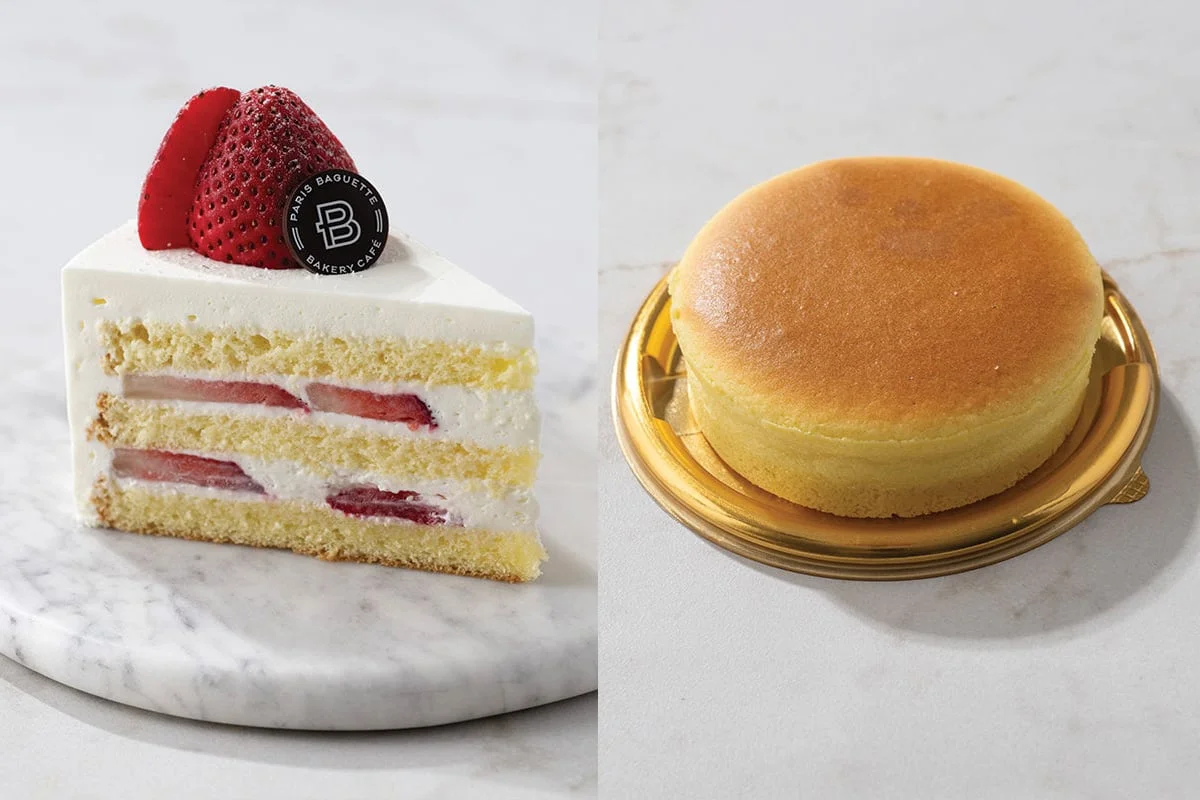 Texture takes the proverbial cake at Paris Baguette with by-the-slice options including the lighter-than-air Strawberry Soft Cream Cake Slice (left) and the soufflé-style Heavenly Cheesecake (right).