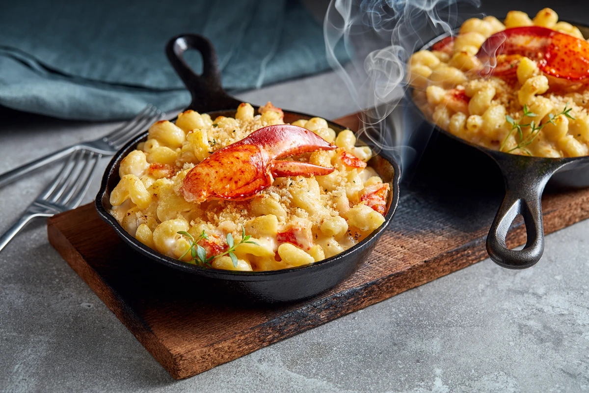 This Smoked Cheddar King Crab and Lobster Mac N Cheese serves as a standout example of the hi-lo trend, pairing familiar comfort with upscale ingredients. Chef Alex Hoefer of 34 Restaurant & Bar in New Orleans, starts with Barilla Cellentani, coating it in a rich, slow-simmered Mornay sauce made with heavy cream, half and half, a touch of Sriracha and a trio of cheeses—smoked cheddar, sharp white cheddar and Gruyère—for layered depth and subtle heat. King crab and lobster are folded into the pasta, with additional whole claw and knuckle pieces reserved for an impressive finish. The dish is portioned into cast-iron crocks and served on a smoldering cedar or hickory plank, delivering a dramatic, smoky aroma tableside. Optional herbed panko adds crunch, completing a dish that’s indulgent, theatrical and rooted in craveable familiarity.