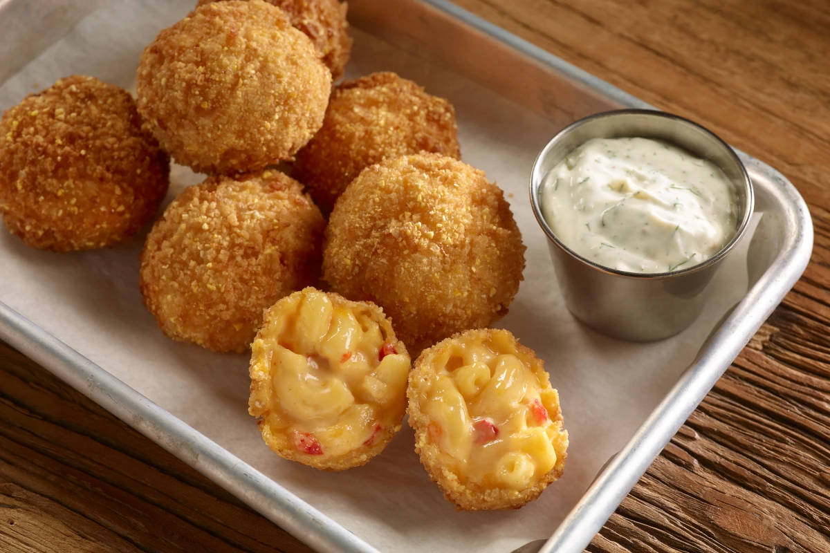 This Nashville Hot Pimento Mac and Cheese Bites is actually an AI-generated concept that intelligently transforms classic comfort into a Southern-inspired crispy, craveable appetizer. Barilla Macaroni is coated in a creamy blend of sharp cheddar and pimento cheese, then chilled until firm. The mac and cheese is shaped into bite-sized balls, breaded in a bold mix of panko, cornmeal and Nashville hot seasoning, and fried until golden and crunchy on the outside, rich and creamy on the inside. Paired with a cool, herbaceous dill dipping sauce, this dish balances heat with freshness.
