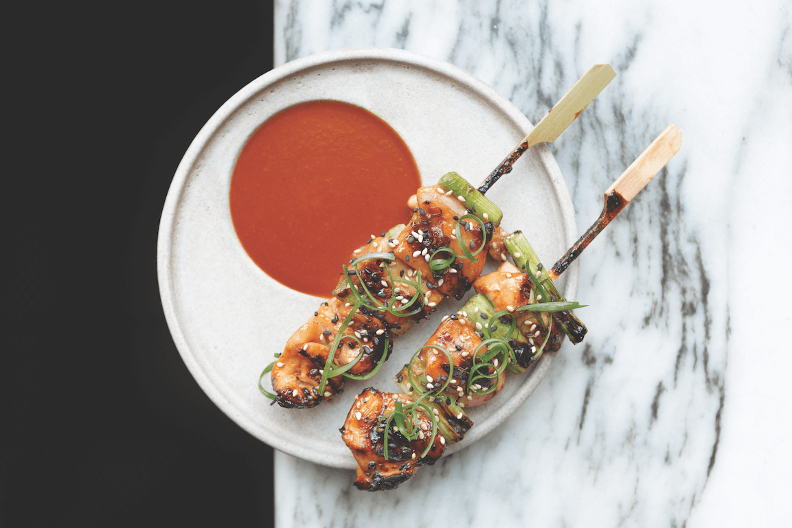 Saffy’s, a Middle Eastern restaurant in Los Angeles, offers a prime example, giving familiar skewers an unmistakable California quality. The Lamb Kebab is seasoned with habanero, shallots, ginger, garam masala and cilantro and the Chicken Shashlik with garlic, cumin, cinnamon, green fenugreek and sumac. A trio of accompaniments—tahini chopped salad, chile crunch and amba—ensures memorable contrasts of texture and flavor. Uchiba, a bar-centric modern Japanese spot in Dallas features a yakitori grill menu, demonstrating mindful attention to bold flavor building. Its skewers of Chicken Thigh are glazed with kimchi caramel, grilled with negi (Japanese long onion), then finished with lime juice. The Bulgogi-Marinated Wagyu Flank Steak skewers are flavored with lemon juice, chile oil and lemon zest, and served with crispy potatoes cooked in hon dashi plus a side of yuzu kosho aïoli. At Nonono, a contemporary yakitori and ramen house in New York, skewer presentations are dramatic—and packed with umami. The Yuzukosho Nori boasts chicken thigh with a thick schmear of nori and yuzu kosho pepper blend topping the meat.