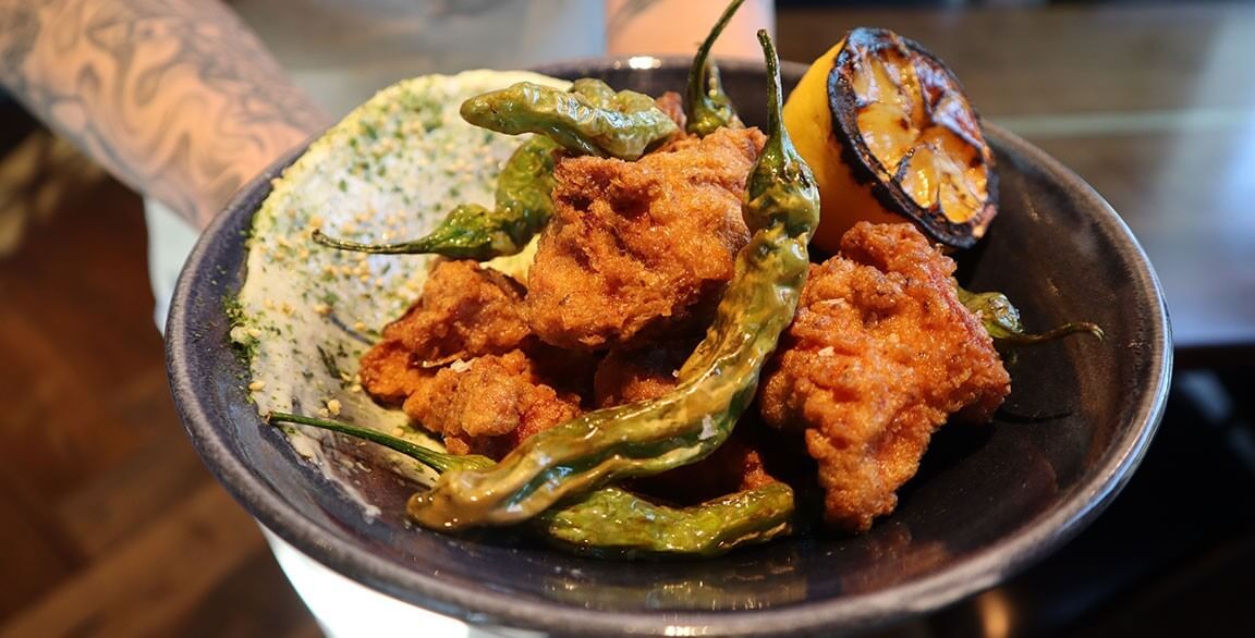 Chicken Karaage with shishito peppers, wasabi aïoli, furikake and charred lemon