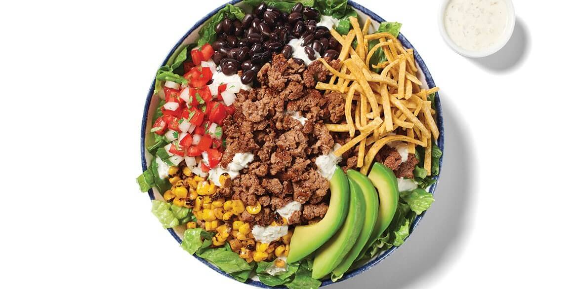 The dish overflows with hearty ingredients that deliver a diverse array of flavors and textures: plant-based meat crumbles, romaine, black beans, roasted corn, salsa fresca, tortilla strips and sliced Hass avocado, finished with a signature pickled jalapeño-ranch dressing. “The textural layering is as important as the flavors, with soft, warm bites of ‘meat’ and beans offset by crunchy cool bites of lettuce and tortilla strips,” says Rubio. While the chain has incorporated the plant-based meat into multiple menu items, the Taco Salad is the best seller among them.