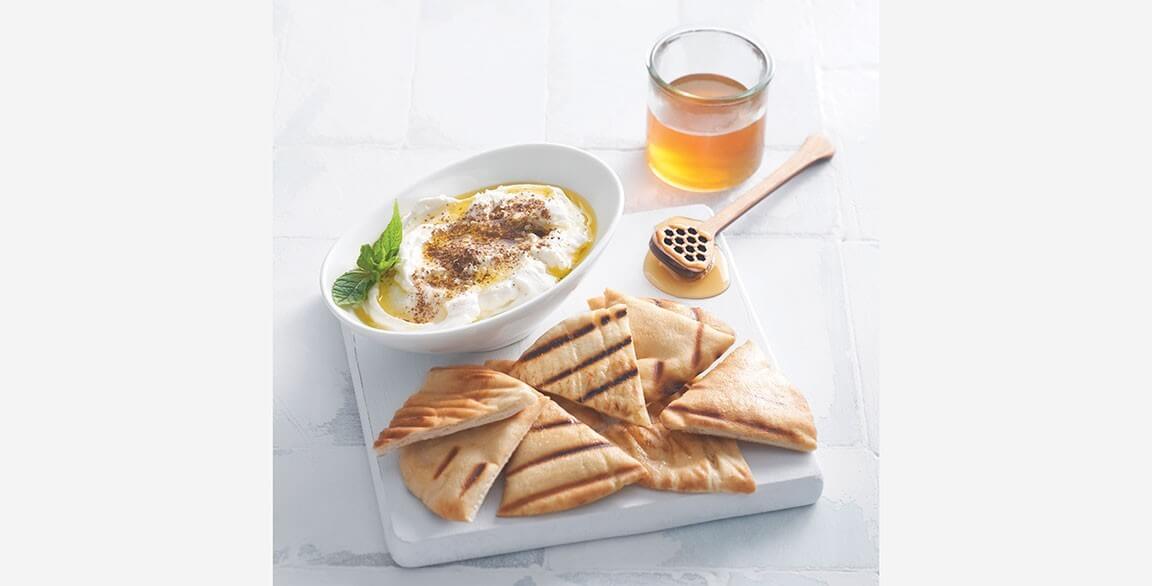 Lebanese Labneh Dip with za’atar-spiced honey drizzle, served with honey-grilled pita
