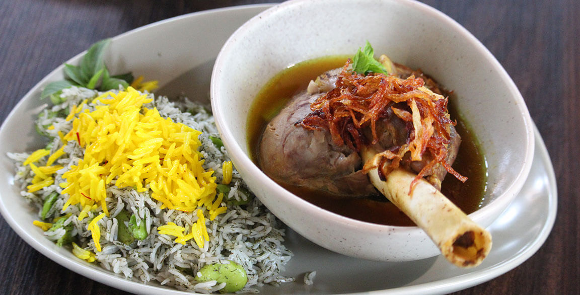 Slow Cooked Lamb Shank with Persian spices, caramelized onions, saffron, fava beans and dill basmati rice