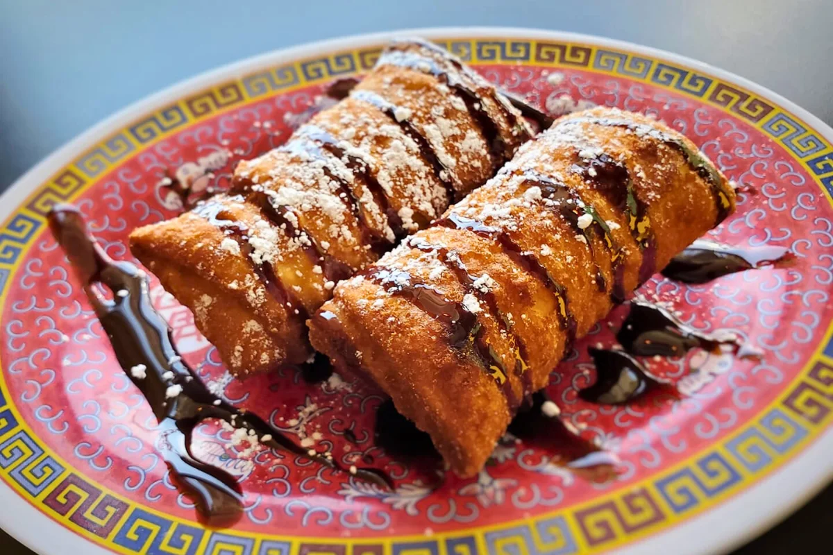 Fried egg rolls become an unexpected carrier for raspberry cheesecake at Fong’s Pizza, which finishes the dish with chocolate sauce and powdered sugar.