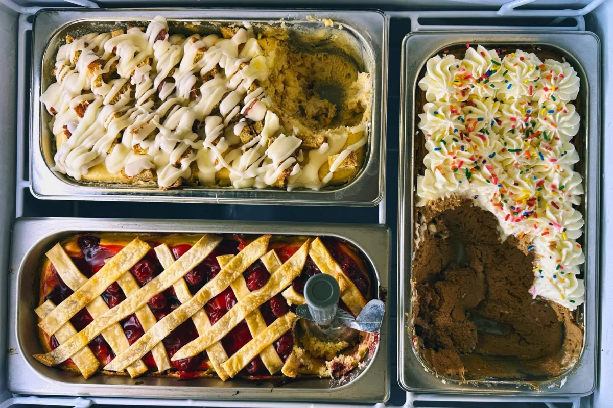 Scoopable Cheesecake Bar: nine gourmet monthly flavors like Tie Dye, Irish Affogato, Apple Fritter, Cherry Pie à la Mode, Chocolate-Covered Pretzel