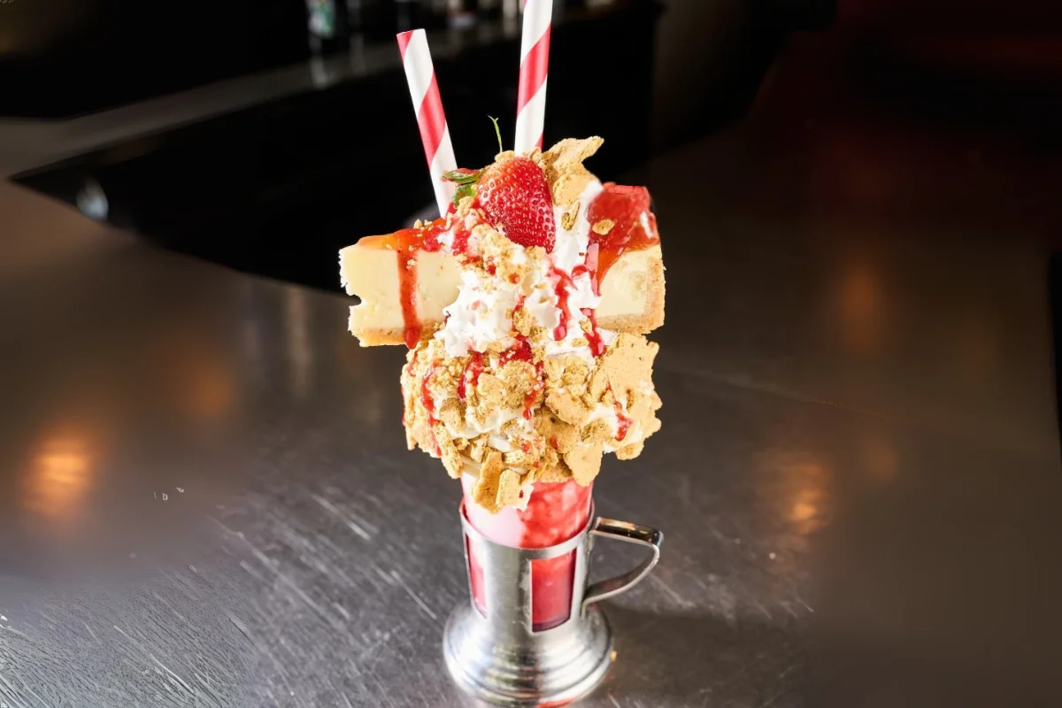 The New Yorker: strawberry milkshake with a vanilla-frosted rim, crushed graham crackers, cheesecake “garnish,” whipped cream, fresh strawberries and strawberry sauce