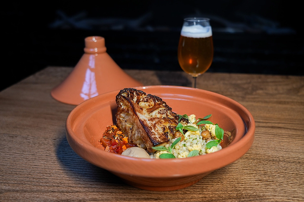 Nevertheless, the confit technique is equally impactful when used to liven up a veggie-centric dish. Bingham often deploys it to add depth to the restaurant’s vegetarian offerings, like the confit cauliflower entrée. Cauliflower, bay leaf and lemongrass are prepared sous vide in coconut oil for three hours. The crucifer is then charred with a blowtorch and served with dukkah-spiced couscous and a sweet-spicy matbucha. The fat used for the confit is part of what makes the dish so special, says Bingham. “The coconut oil adds a subtle floral note that complements the Moroccan flavors of the dish.”