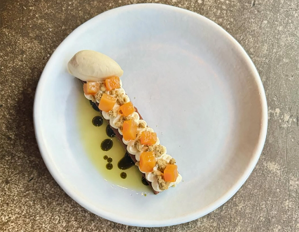 Dirt Candy in New York City is known for its creative vegetable dishes, and sweets are no exception. For her turnip dessert, pastry chef Rachel Bossett combines Middle Eastern flavors with French technique for something singular in its build and flavor profile. She tops a flourless chocolate olive oil cake with whipped labneh, za’atar crumbles and orange confit turnips for a dessert that’s described as “a little bit Creamsicle, a little bit candy bar.”