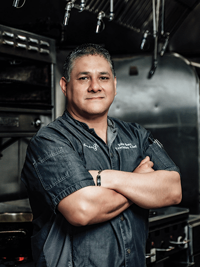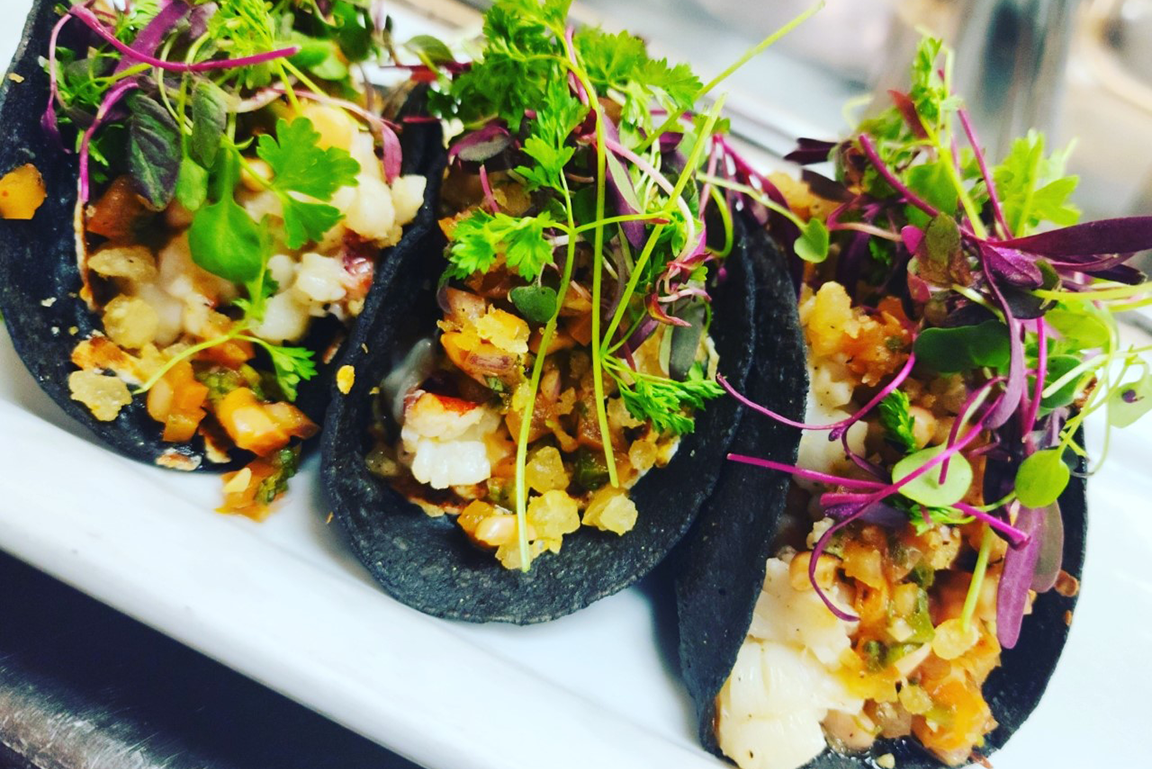 The lobster tail meat is butter poached to ensure a tender, rich experience. Baez considered the finishing sauce, salsa and garnishes with care. “For example, the Champagne-chipotlecorn salsa plays on the decadent combination of lobster and Champagne,” he says, adding that it balances the salinity of the tortillas, the richness of the lobster, tartness from citrus in the avocado balm (a proprietary sauce at Border Grill), the sweetness of the corn and the crunchy textural contrast of crispy hominy.