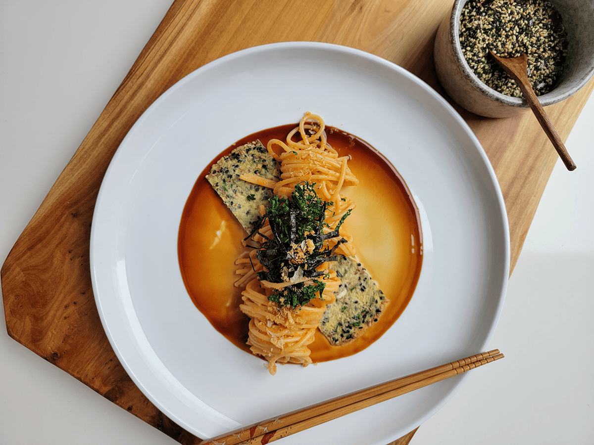 Ian Ramirez, owner of Mad Honey Culinary Studio, a culinary strategy consultancy, offers his take on Wafu Italian cuisine. His Cured Chile Pepper Mentaiko Pasta is a riff on a Japanese dish that brings two worlds together, marries the comforting familiarity and “al dente” texture of pasta with the richness of spiced cod roe. Mentaiko pasta serves up an ideal balance between adventure and comfort. “Mentaiko pasta is the Japanese play on cacio e pepe,” says Ramirez. “For my iteration, I wanted to keep it umami-rich and introduce more Japanese flavors while still making sure the pasta was the star,” says Ramirez. He starts by spooning unagi sauce onto the plate, then adding a surprise element over top: a thin omelette, seasoned with furikake and toasted sesame seeds. Next, he lays down a nest of Barilla Spaghetti that he has tossed in a sauce of mentaiko eggs, Parmesan, half and half, melted butter, black pepper and soy sauce. To garnish, Ramirez adds a fried quail egg, shiso leaf and nori strips.