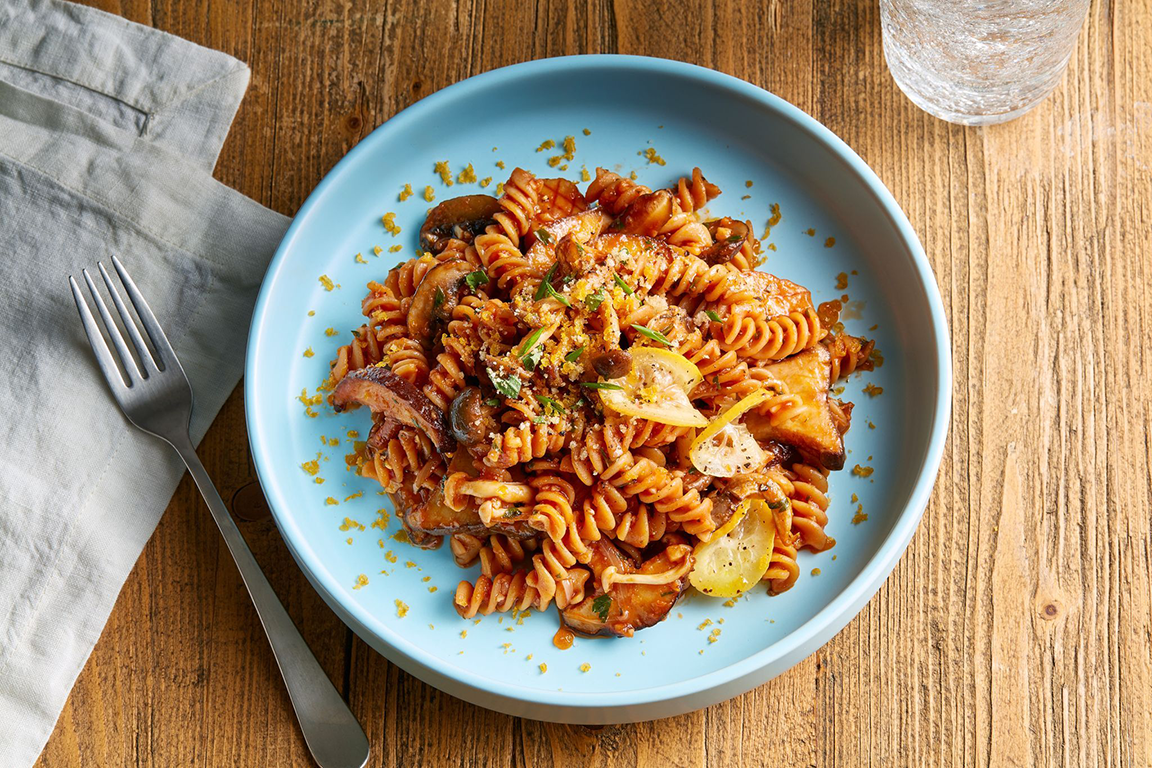 Photo Credit: Barilla for Professionals For his Chickpea Rotini With Wild Mushroom Ragout, Mushroom Garum, Lemon Confit and Toasted-Herbed Bread Crumbs, Maurelli sources Barilla Chickpea Rotini, a gluten-free product made with only one ingredient—chickpeas. Featuring a medley of roasted wild mushrooms and a robust tomato sauce, the chickpea pasta offers up a wholesome, plant-based profile. “The meaty mushrooms work well with the texture of the pasta, and the smoked mushroom garum deepens the flavor—the garum makes the flavor pop, similar to adding vinegar to tomato sauce,” he says. “This is a rich, umami-forward dish. Slivers of lemon confit brighten the pasta dish, adding another tone.”