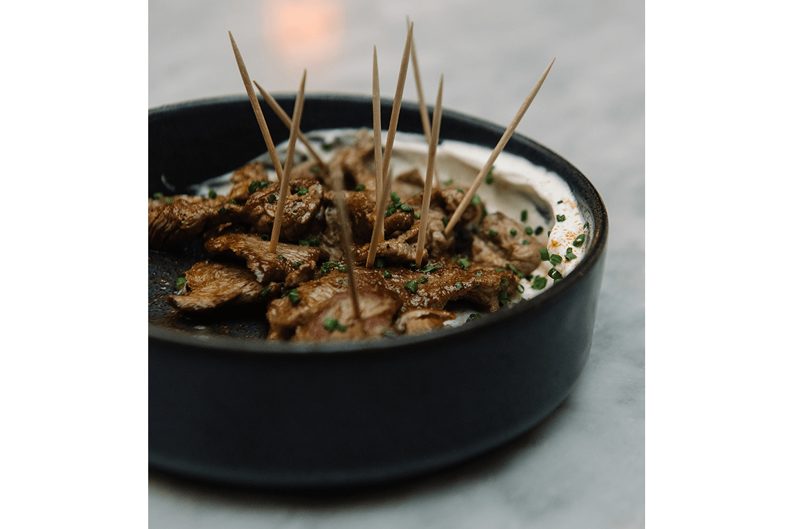 At Aba, the skewer concept is downsized to a bar bite or catered snack with this Toothpick Lamb dish, marinated in arak and sautéed in a lemon-kosho vinaigrette, served with a swipe of cooling Greek yogurt.