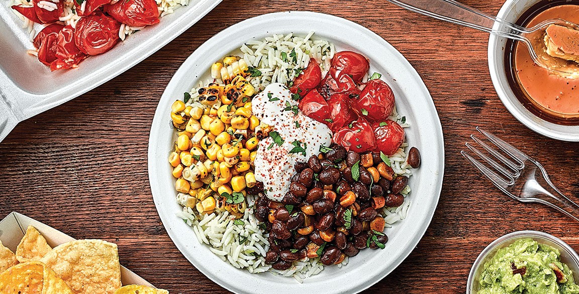 Designed for takeout, this Black Bean Fiesta Bowl features cilantro-lime rice, Mexican-spiced black beans, grilled corn and blistered cherry tomatoes.