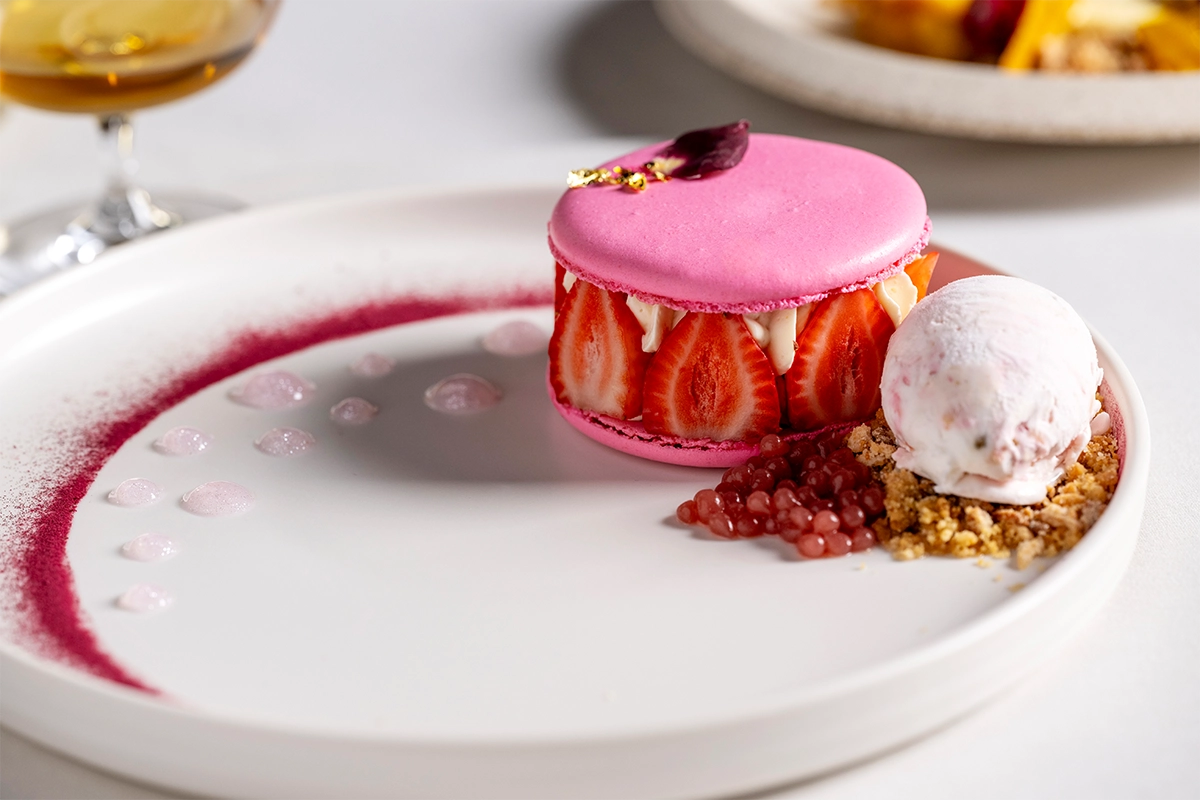 “Its appearance makes you stop and take notice. The bright pink of the macaron with the berries makes it an Instagrammable dish, which plays into its success,” says Estay. “The flavors we achieved are not typical for a kosher fine-dining restaurant and are always a conversation piece at the table.”