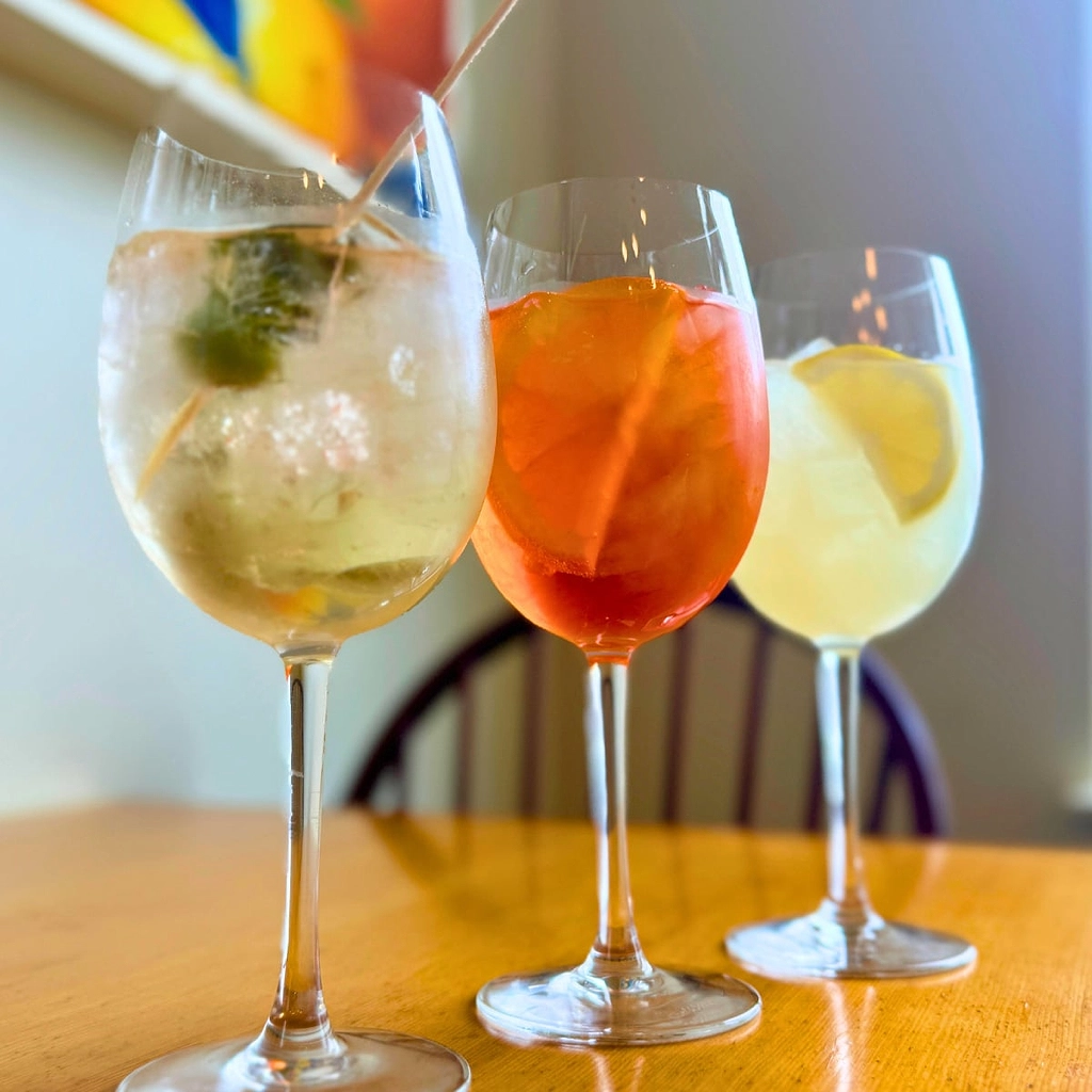 Credit: Pomelia The spritz selection at Pomelia features a variety of liqueurs and flavor profiles: from the briny accents of the olive-spiked Italicus (left) to the classic Aperol spritz (center) and the slightly sweeter limoncello variation.