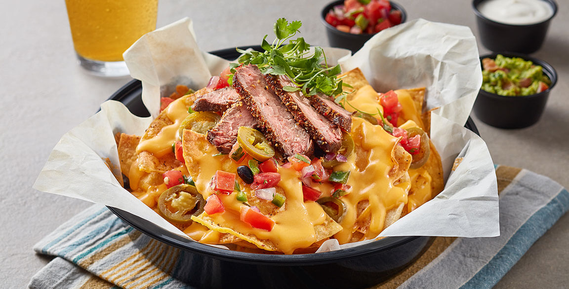 8. After pulling the pan for the second time from the cheese melter, top it evenly with the hot steak, pickled jalapeños, and Pico de Gallo, ensuring every chip has full coverage. Drizzle the Beer Crema in a zig-zag pattern from corner to corner. Evenly sprinkle the cilantro over the nachos (not just in the center).