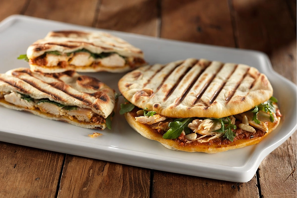 Stonefire Mini Naan® is pressed into service in this Roasted Chicken and Arugula Panini. Naan’s natural char complement the grill marks for a sandwich that looks as delicious as it tastes.