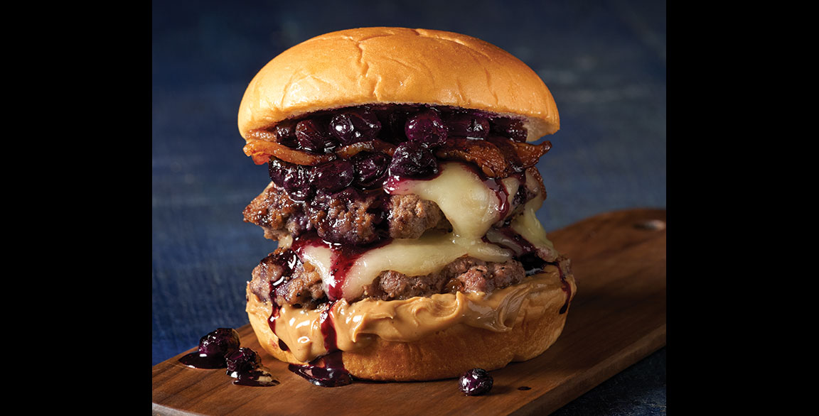 The PB&B Burger plays up the craveable combination of savory, hot and sweet with ingredients like creamy peanut butter, peppery bacon and sweet-tart blueberry jam.