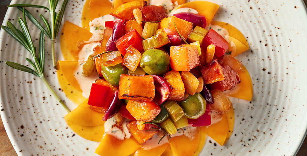 - Arrange squash petals on a plate. Drizzle squash with curry dressing and top with a scoop of Soy-Glazed Red Grape Caponata and Butternut Squash.