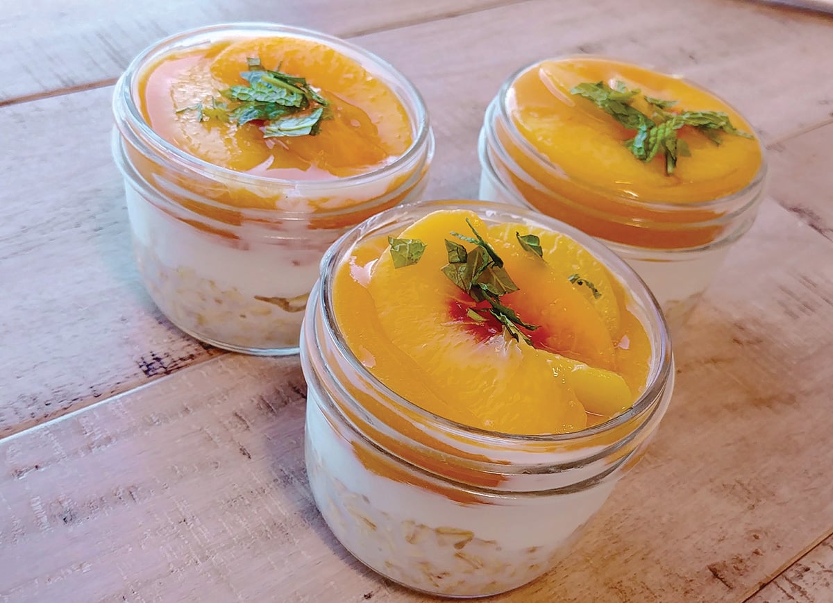 Fruit can elevate easy-prep menu items perfect for small-space kitchens, like these Just Peachy Overnight Oats.