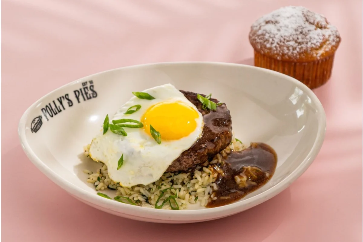 The limited-time Loco Moco at Polly’s Pies featured herbed rice, burger patty, brown gravy and sunny-side-up egg—plus a banana muffin on the side for even more tropical vibes.