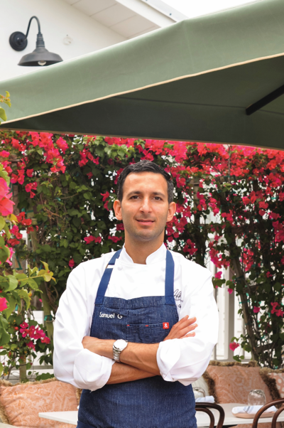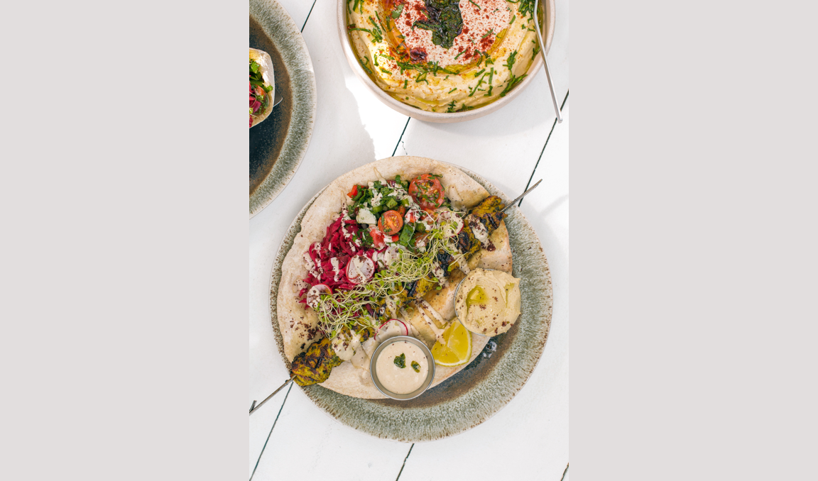 “Chicken breast is marinated for 24 hours in lemon, turmeric, garlic, herbs and sumac,” says Gorenstein, Executive Chef. “It is then grilled over an open flame, so the char flavor from the fi re really comes through.” The skewers are served with fi re-baked laffa, pickled cabbage, fresh herbs and garlicky toum. “This dish is fun,” he says. “It can be eaten with a knife and fork, or the meat can be taken off the skewer and rolled up into the laffa bread.”