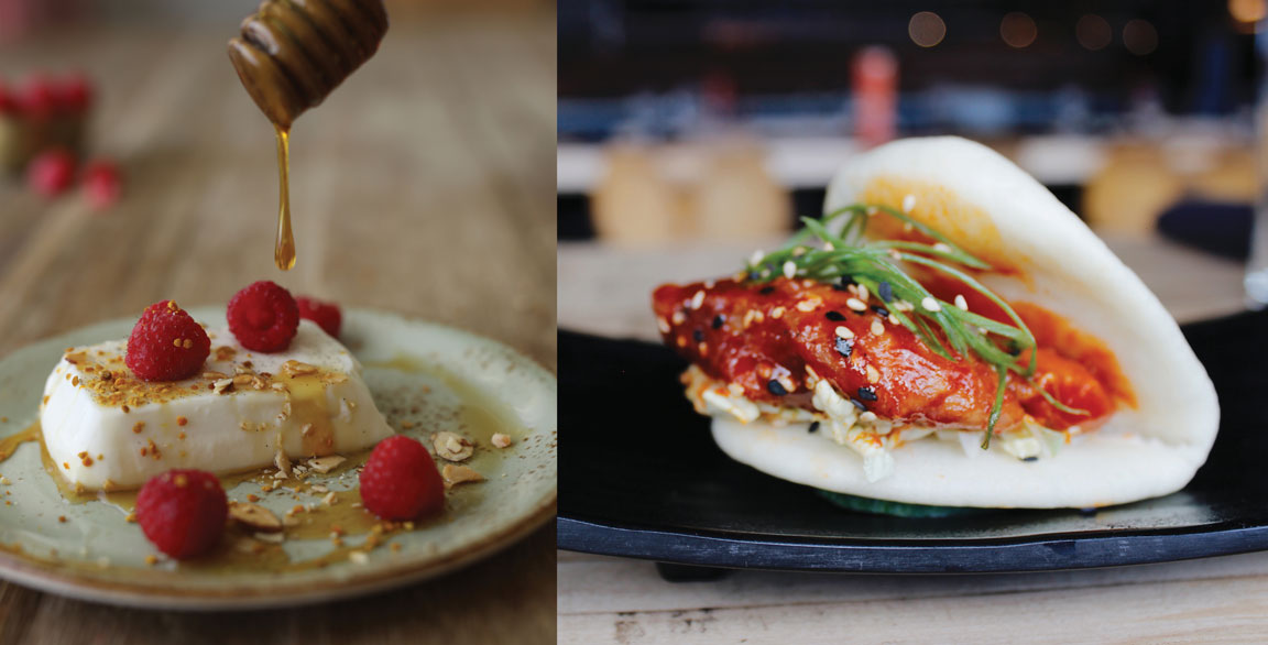Lazy Dog taps into regionality by calling out local hive honey drizzled over its Vanilla Bean Custard (left). Ace Eat Serve kicks hot honey up a notch with a gochujang-chile honey glaze on its Korean Fried Chicken Bao (right).