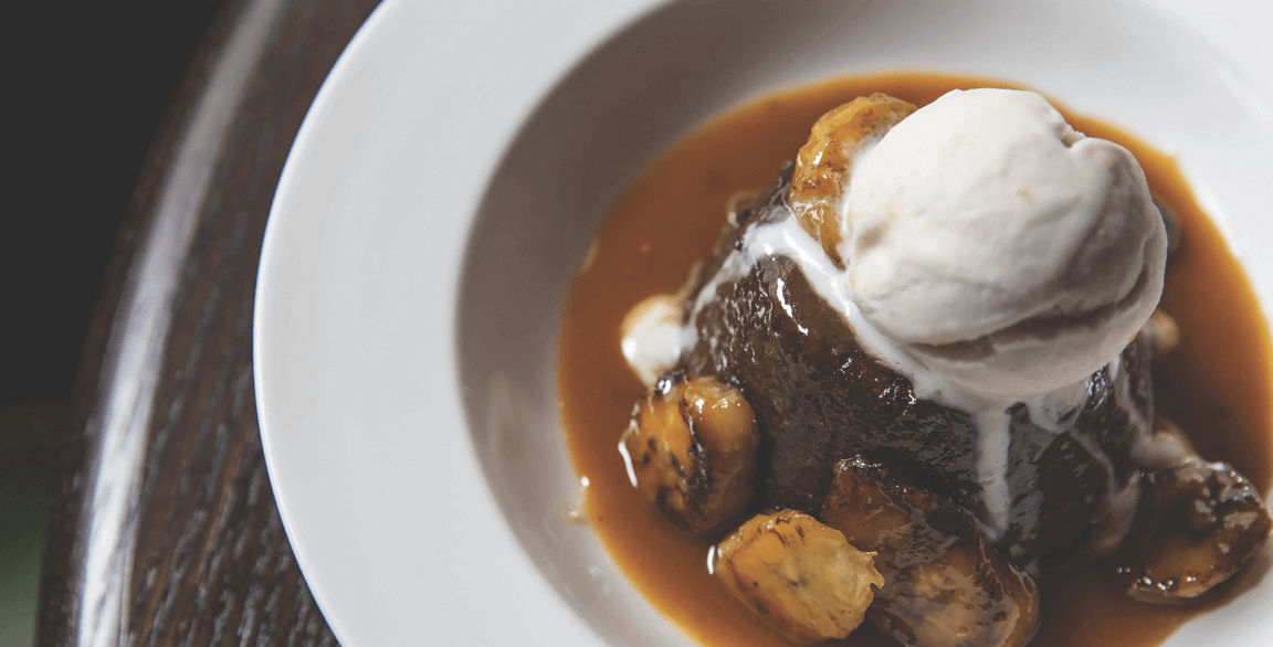 Jack & Charlie’s 118 in New York menus a Sticky Toffee Bread Pudding with a rum-butterscotch sauce and roasted banana ice cream.