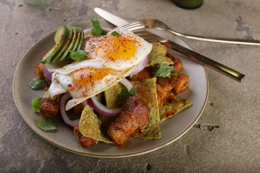 Pork Belly Chilaquiles serve up the comfort of this Mexican classic, but deliver something new with crispy pork belly and sunny-side eggs over tortilla chips simmered in tomatillo salsa verde.