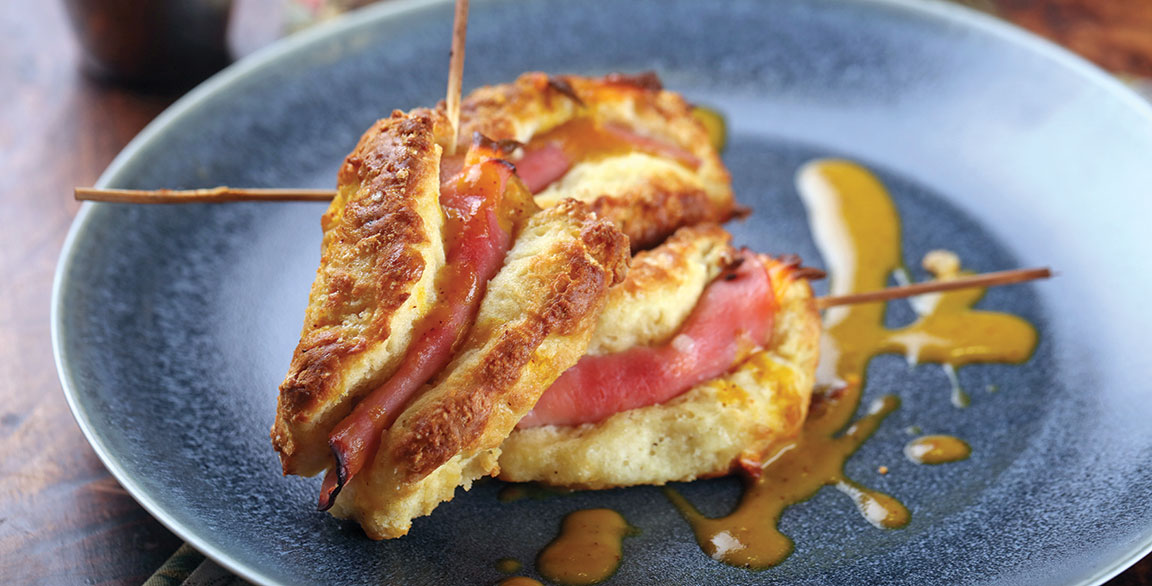 Brian West, a chef consultant based in San Antonio, Texas, says his successful comfort food dishes always relate back to his childhood. “That means ‘Does it have a homemade, Grandma-made-this feel?’” he says. She was the inspiration for his Ham-Stuffed Buttermilk Biscuit Skewers, served with Carolina Gold Dipping Sauce and Coleslaw.