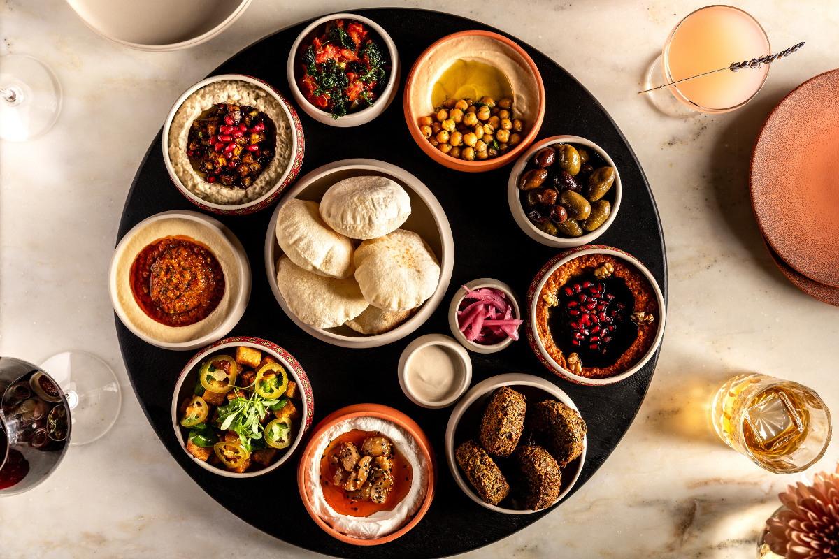 There is smoky baba ghanouj made with tahini and charred eggplant, creamy garlic labneh with confit garlic, and wood-roasted matbucha, a traditional Eastern Med condiment made of tomato and red pepper. Falafel are dark and crispy on the outside, green and herbaceous on the inside, with tahini sauce, tomato and mint. Batata harra, or triple-cooked potatoes, radiate garlic and heat. Two types of hummus (traditional and a sambal-topped version), roasted red pepper-and-walnut muhammara with cilantro oil, and green and black olives complete the resplendent platter, which is served with freshly baked pita. “It’s not only delicious but fun to eat and enjoy with friends, family or even a date,” says Hayek.
